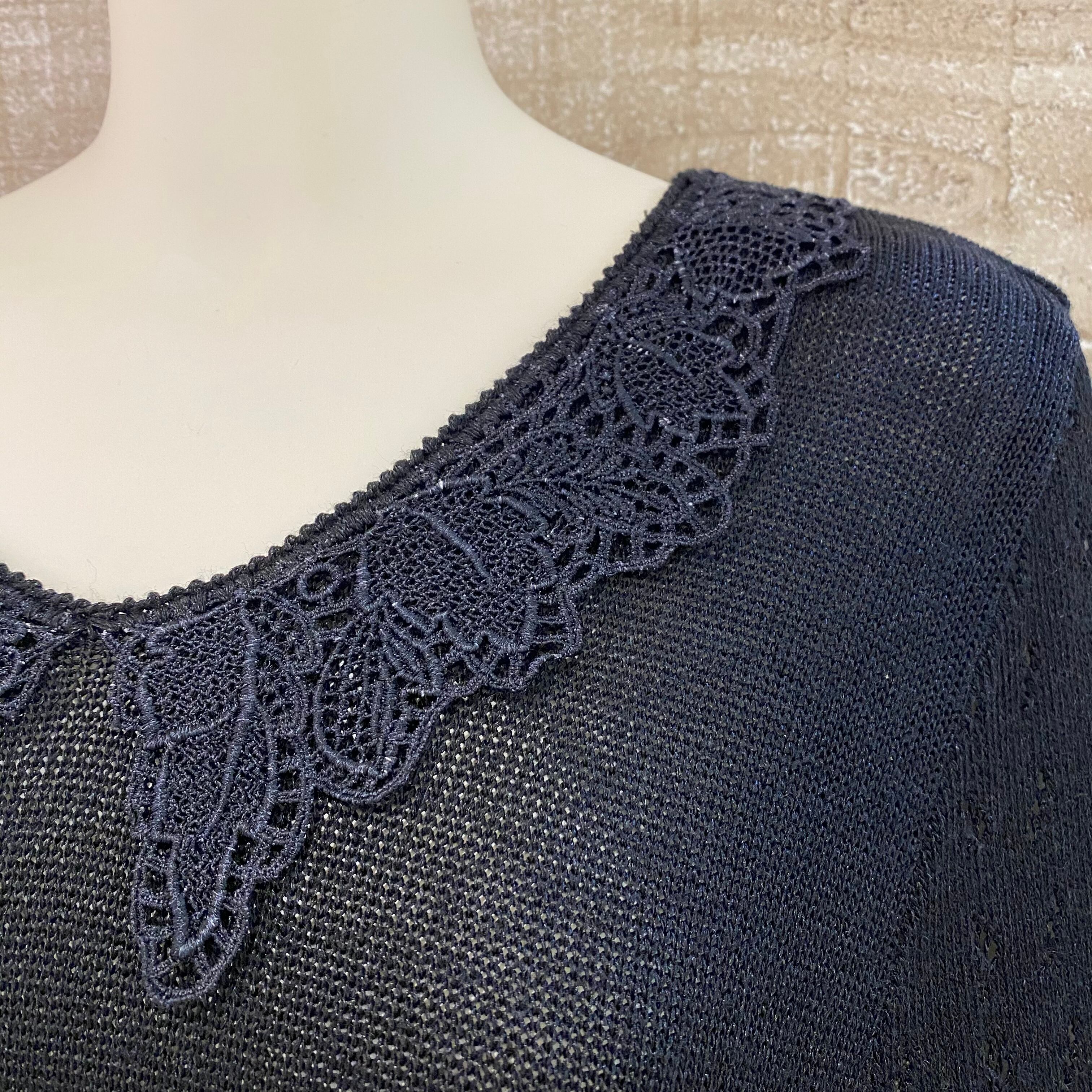 襟のレースと袖の透かし編みが